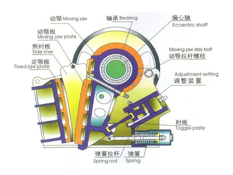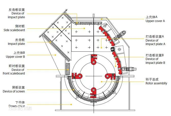 La structure est simple et se compose d'un boîtier, d'un rotor et d'une plaque d'impact. La partie principale de travail du concasseur à impact est un rotor rotatif à grande vitesse avec un marteau à plaque. Pendant le processus d'impact alternatif, les blocs de matériaux entrent également en collision les uns avec les autres. Comme le matériau est touché par le marteau, l'impact de la plaque d'impact et la collision entre eux, les fissures et les relâches sont constamment générés à l'intérieur, ce qui mène finalement à l'écrasement. Le dispositif d'impact est utilisé pour résister au matériau frappé par le marteau de plaque et le rebondir. Le composant principal est la plaque d'impact, qui est soudée avec des plaques en acier. Il y a des revêtements résistants à l'usure sur sa surface d'impact, et certains utilisent des barres d'impact ou des plaques de réseau.